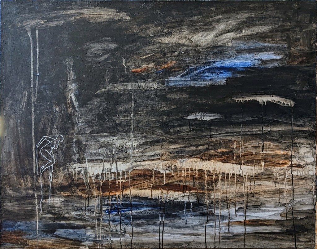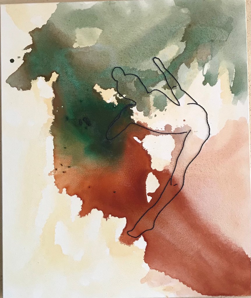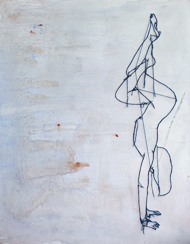 The painting is made of the left overs of us. It is painted on a rescuedcanvas, using the leftover water from another painting (Abyss). The figure is sewnonto the back of the canvas presenting what is meant to be hidden. The painting, while being very light, is also left with a dirty textured feeling, reflecting the reality of the internal human experience. When we share who we are inside, it is not alwaysclean, but it is always beautiful.
