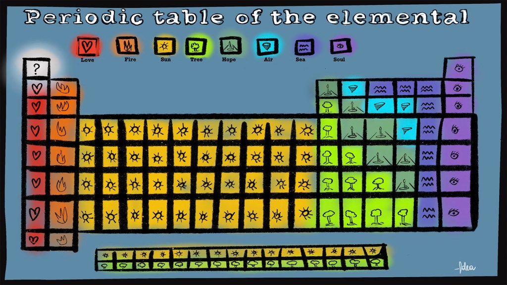 The periodic table of the elements is an organizing icon of chemistry and is widely used in physics and other sciences. What I really find impressive is that from Mr. Mendeleev first Table of the elements (the end of 1800) until today it changed many times being not fix but “in a continuous evolution”. This illustration focus on this evolution, putting new elements (and a question mark) at the center. What is really essential today for humanity?